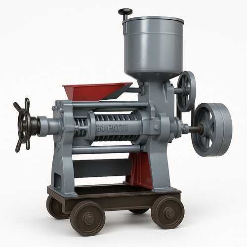 Commercial expeller machine with 64 patti. M.S. body material and paint-coated finish. Requires 10 HP power and handles up to 5 tons per day capacity.