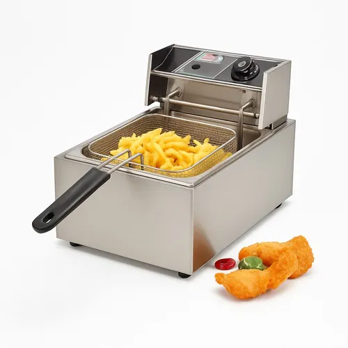 A 6L commercial electric deep fryer with a production capacity of 6 LTR. Includes a fryer jali with stand. Approximate dimensions are 265 X 425 X 280 mm, weighing about 4Kg.