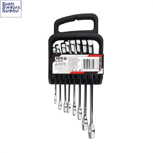 This 8-piece combination ratchet spanner set, made from CrV steel, features a plastic hanger for convenient storage. Ideal for hand tool applications requiring versatile wrenching capabilities.