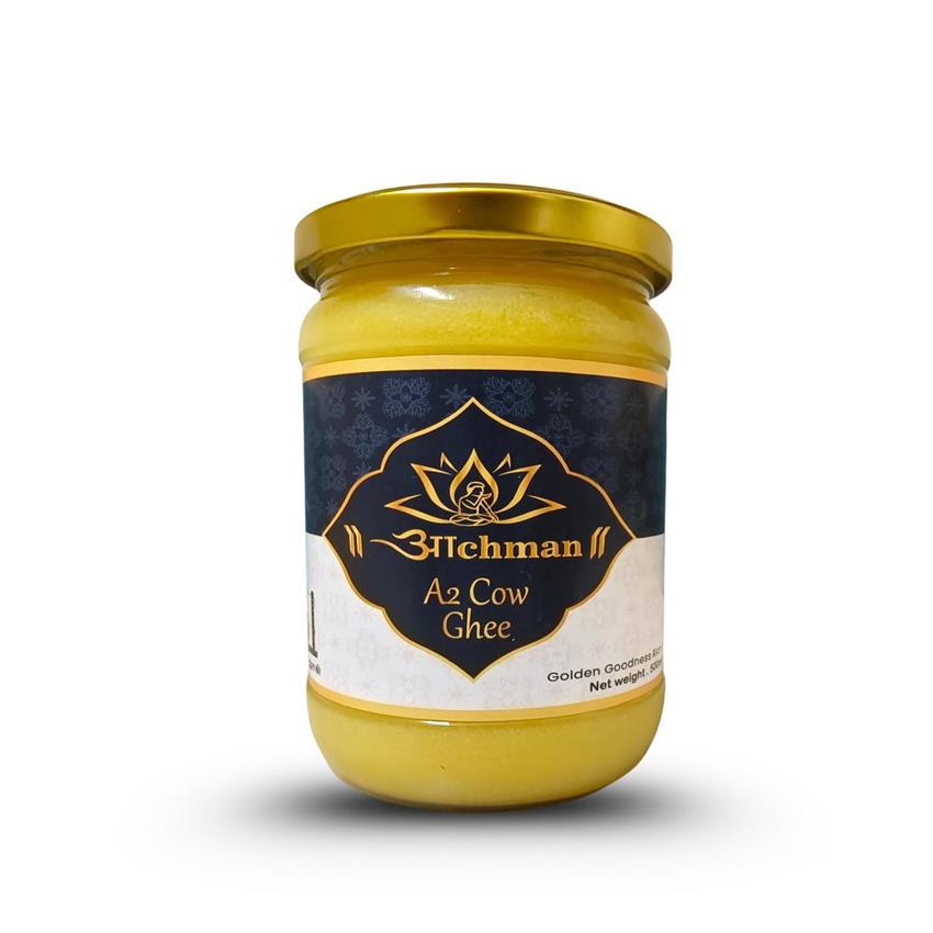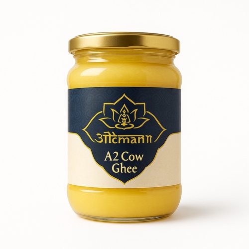 A2 Cow Ghee, 500 ML packaging in a glass jar. Pale yellow color, 12 months shelf life. Ideal for cooking applications.