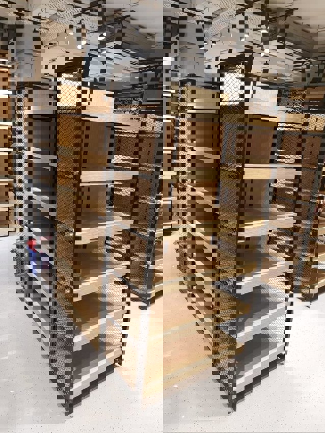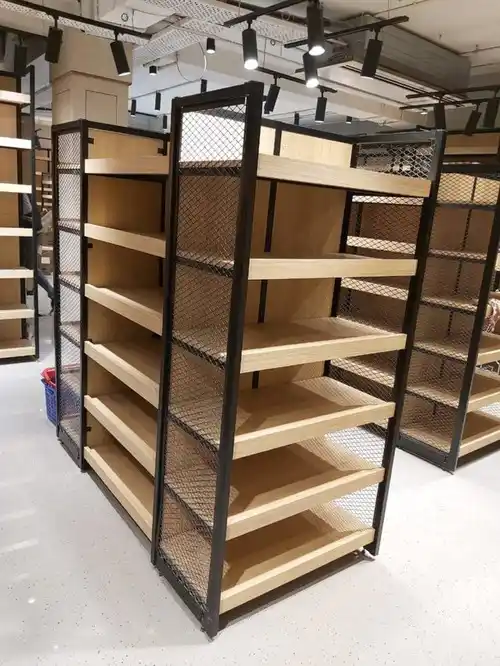 Brown wooden wall rack, 6x3 feet. Features 10 shelves with a 60 kg storage capacity. Ideal for supermarket applications. Minimum order quantity of 10 pieces.