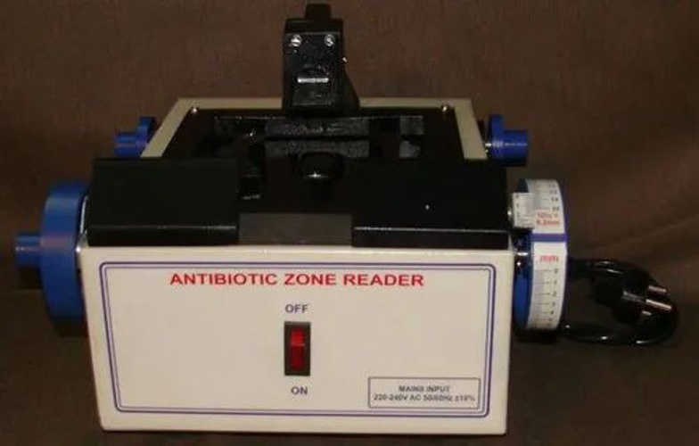 Laboratory-grade Antibiotic Zone Reader. Electric-powered at 220V, 50-60 Hz. Constructed from MS material for durable laboratory applications.