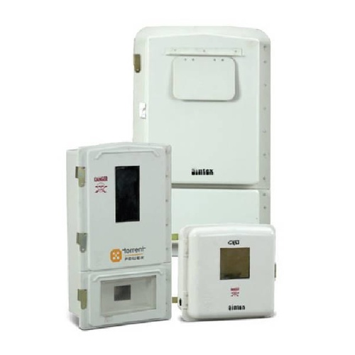 Rectangular and square meter boxes made from ABS and FRP. Features include flameproof, weatherproof, and waterproof properties. Off-white color, wall-mounted type.