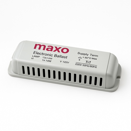 ABS Plastic Maxo Electronic Ballast. Features 14W wattage and 12V voltage for Tubelight applications. Utilizes instant start method.
