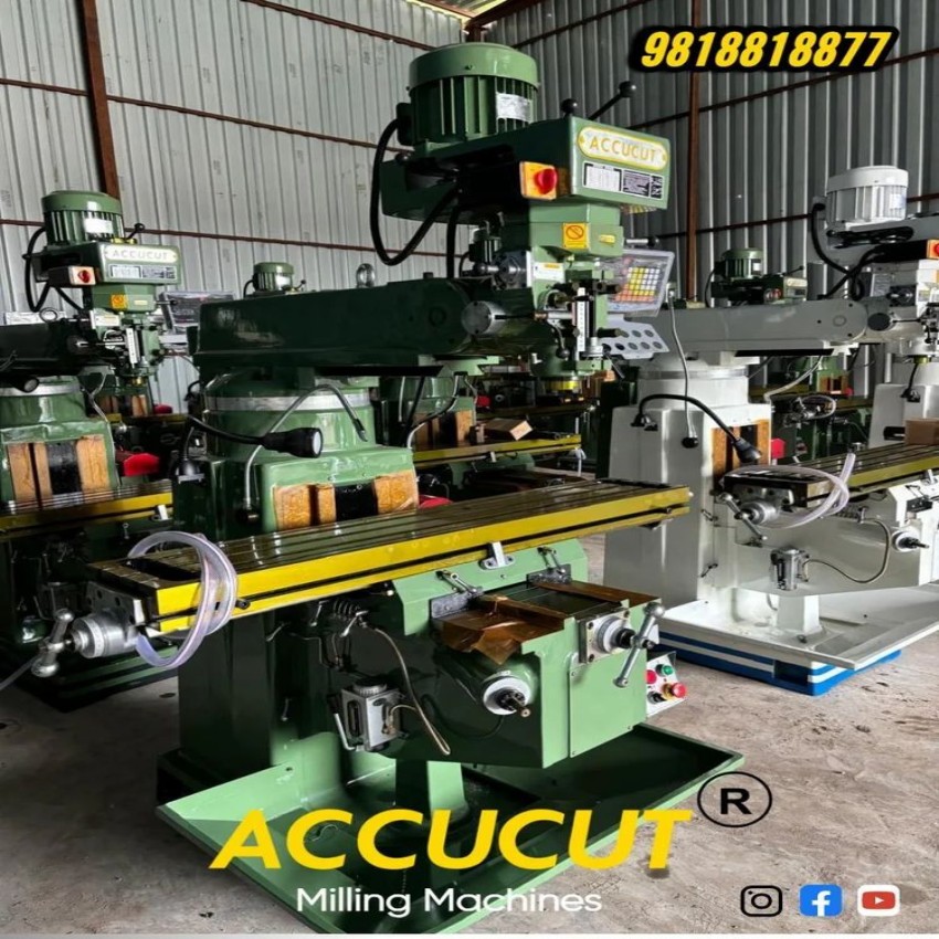 Semi-automatic ACCUCUT Milling Machine with 3 HP motors, 16 speeds (66-4540 RPM), and ISO30 spindle nose. Features 1370x254mm working surface.