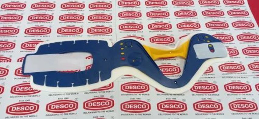 Adjustable contoured cervical machine for neck support. Portable, blue, and foldable. Dimensions: 60.5 x 50 x 41 cm. Designed for new applications.