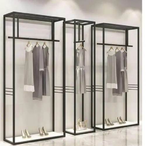 Adjustable mild steel clothing rack with a 2mm thickness and glossy finish. Offers a weight capacity of 80kg. Designed for versatile garment display needs.