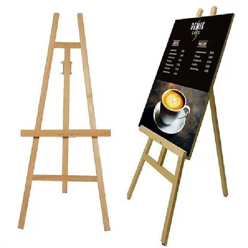 Portable wooden A-frame easel, 5 ft height. Ideal for canvases, frames, and display boards. Features adjustable tray and central grip.
