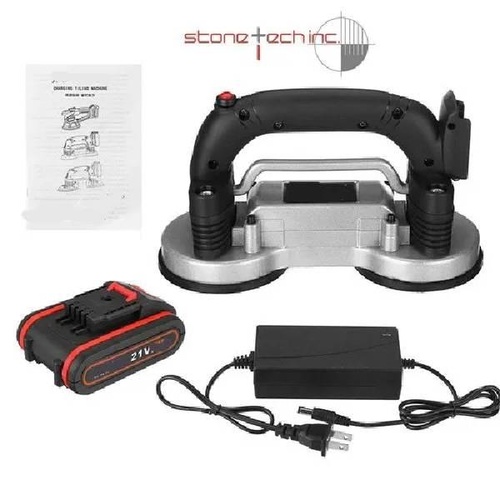 Stainless steel tile vibrator machine with ABS handle. Features 120 Hz/sec vibration, 115mm suction cup diameter, and 5 speed adjustments. 21V battery powered, aluminum alloy case.