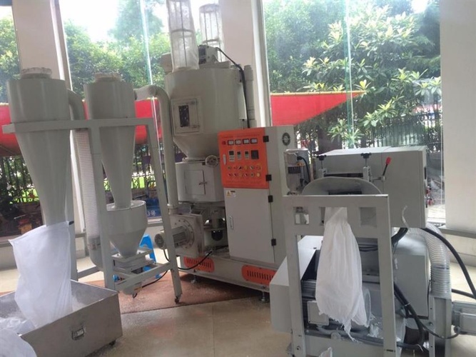 Automatic plastic recycling machine with 50 kg/hr capacity. Features 15 KW motor, 3 KW auxiliary motor, and weighs 1000 Kg. Dimensions: 1.7 X 1.3 X 2.4 mm. Model AE-50.