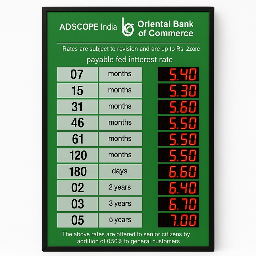 Wall-mounted digital interest rate board with 3 mm pixel pitch. Features a rectangle shape and 2.5x3 feet dimension. Made in India. Suitable for financial institutions.