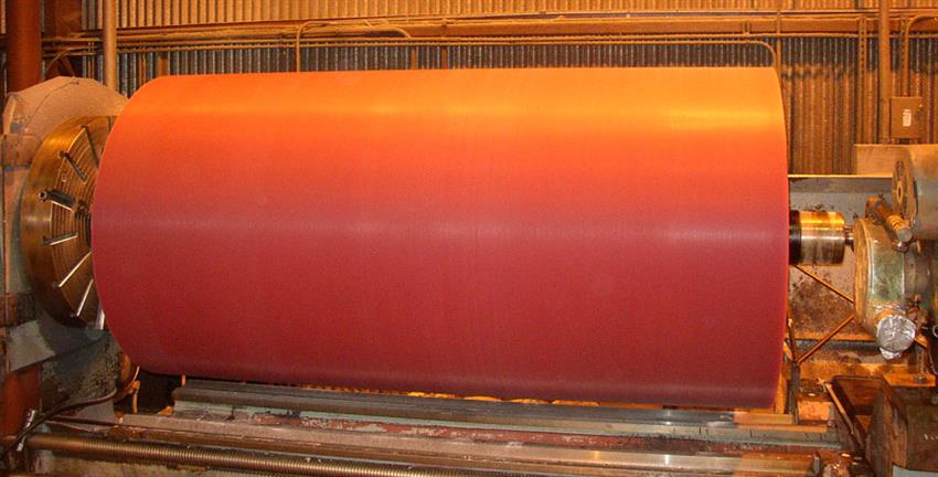 Orange polyurethane rubber roller. Diameter ranges from 50mm to 500mm. Length up to 4500mm. Designed for industrial applications.
