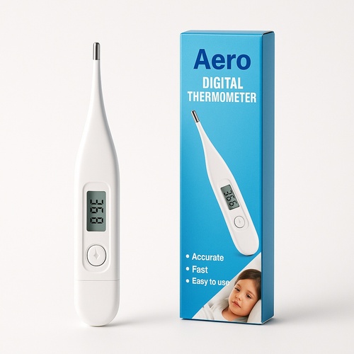 Aero digital thermometer with LCD display. Measures 90-109.9°F, +/- 0.1°C accuracy. Auto-off in 2 mins, ~200 hours battery life. Suitable for hospital, clinic, personal use.