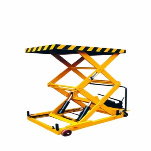 Moving hydraulic powered mobile machine with 10 feet working height. Constructed from SS material for industrial use. Features yellow color and hydraulic lift drive.