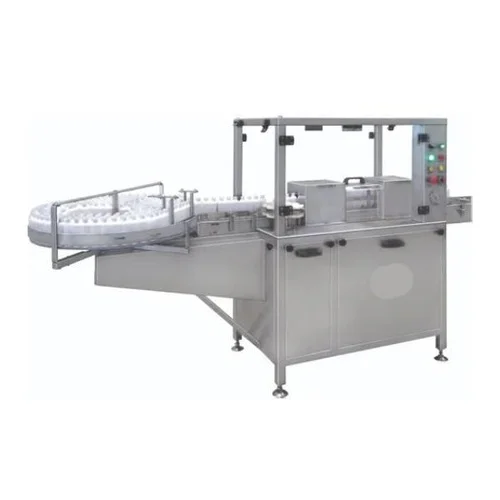 Automatic airjet vacuum cleaning machine for bottles (200-500ml). Features 1+1 HP motor, 3-phase electrical supply, and requires 6 bar pressure, 5 CFM air.