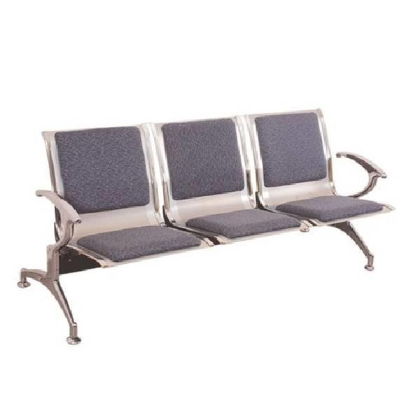 Iron waiting chairs with fabric seats in silver. Designed for airport use. Features a 1-year warranty.