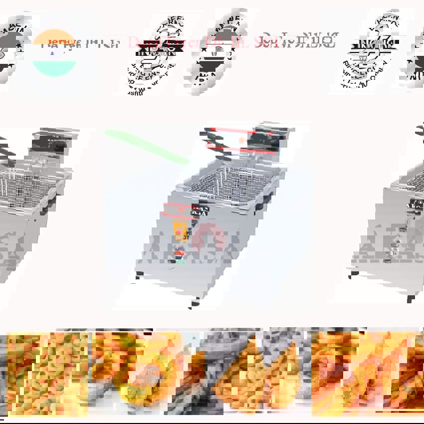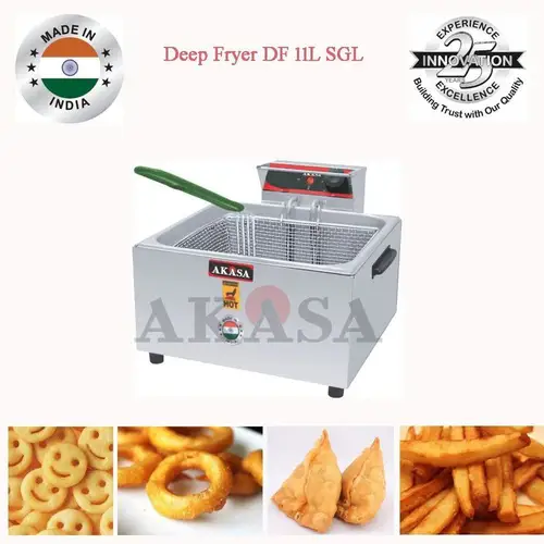 Akasa Indian electric deep fryer device with 10-liter oil capacity. Features stainless steel construction, adjustable temperature up to 300°C, and 1800W power.