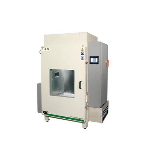 Single/Double/Triple axis HALT chamber with Al-Mg alloy construction. Temperature range -100°C to +200°C, 415V power, PT-100 sensor, HMI+PLC controller.