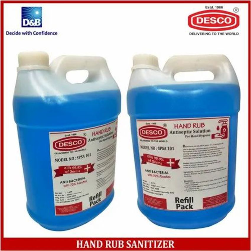 This 5000 ML sanitizer can contains 61-70% alcohol and Aloe Vera for fragrance. Effectively cleanses hands.