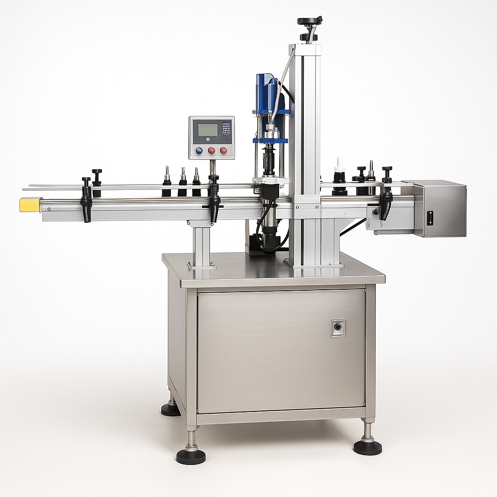 Automatic ALU spray pump capping machine for cosmetics. Features 40 BPM capacity, 220V AC power, and wooden packing. Ideal for high-volume production.