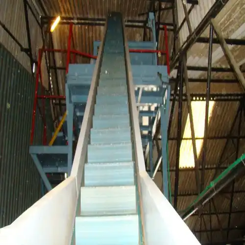 Custom automatic aluminium inclined cleated belt conveyor. Features galvanized surface, capacities of 50-100 kg/ft, and lengths from 1-10 feet.
