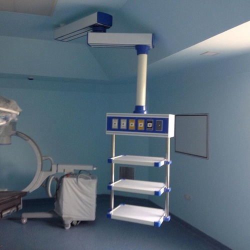 Aluminium double arm pendant, powder coated, with 280° rotation. Features 6 electrical sockets, 100 kg loading capacity, and 1000 mm arm length for hospital use.