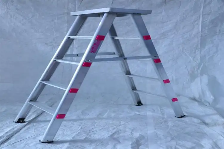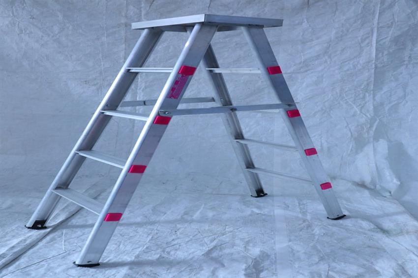 Aluminium folding ladder with polished finish. Tube thickness is 1.3mm. Folded size measures 585x105x2025mm. Model name/number is 'own'.
