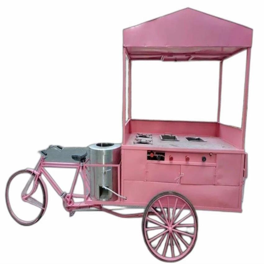 Pink aluminium food cart with color-coated finish. Features 3 wheels and a 500 kg load capacity. Suitable for food applications.