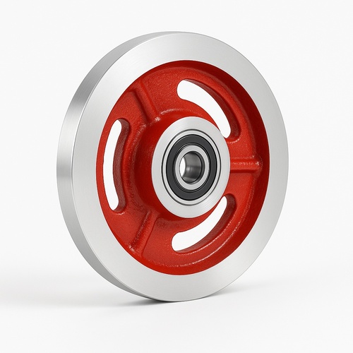 Aluminium pulley, 4" and 5" diameters, red color. Rated for 0.5 ton capacity. Manual operation for double beam cranes. Made in India.