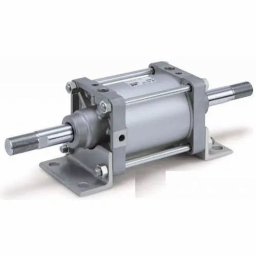 Double acting aluminium pneumatic cylinder in silver finish. Cylindrical shape, designed to move loads along a linear path. Suitable for industrial automation.
