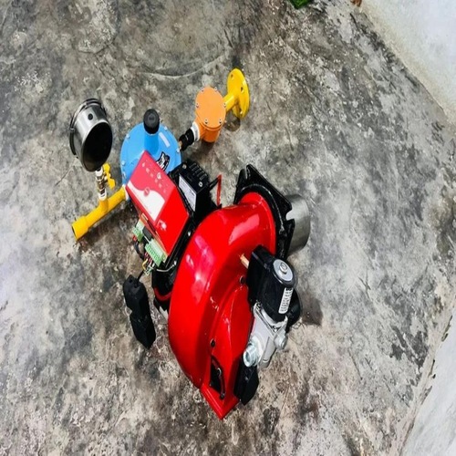 Aluminum Industrial Gas Burner for burning applications. Operates on gas fuel, requires 220V motor start-up current. Durable aluminum construction in red.