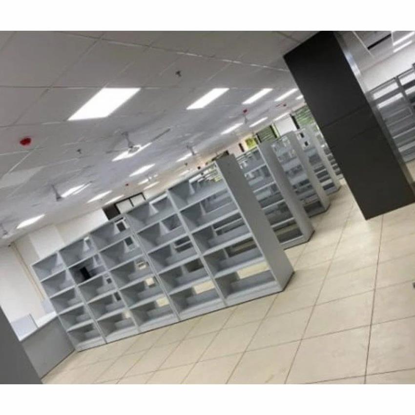 Polished silver aluminum library station furniture. Features a 14mm frame thickness. Minimum order quantity of 50 units. Ideal for library environments.
