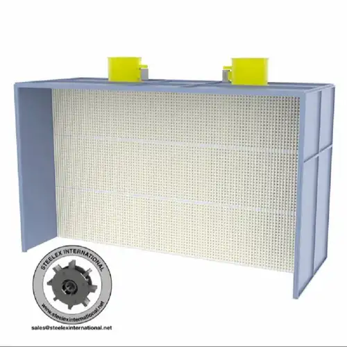 White Andreae suction filter (AF123) for industrial use. Electric powered, 50 Hz frequency, with electric heating and fully undershot air flow. For mild steel.