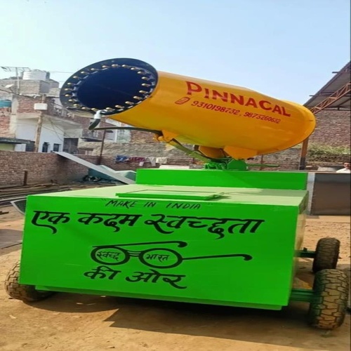 Manual trolley-mounted machine with a 1.5 HP water pump and 1000 Ltr tank. Sprays atomized water droplets for dust suppression with a 25-30 meter throw range and 360-degree rotation.