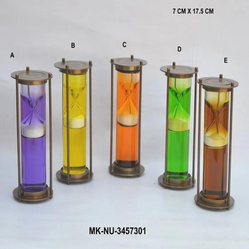Antique brass and glass liquid hourglass timer with a 10-minute duration. Measures 7 x 17.5 cm. Antique finish. Ideal for decorative or functional use.