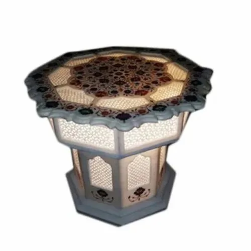 Marble floor lamp with an antique style. Features a printed pattern and shade directing light downwards. Ideal for indoor lighting.