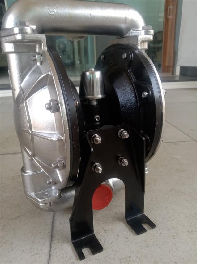 Pneumatic double diaphragm pump (AM21) with stainless steel and aluminum construction. Features 1HP motor, 50 LPM max flow rate, and 200 PSI discharge pressure for liquid transfer.