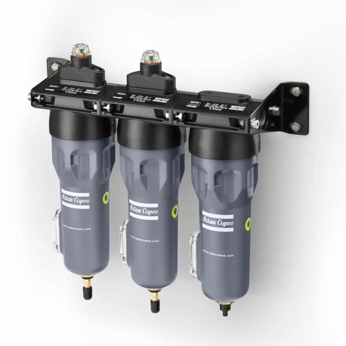 Atlas Copco automatic fiberglass air filter. Made in India, grey color. Utilizes fiberglass filtration medium for efficient air filtration.