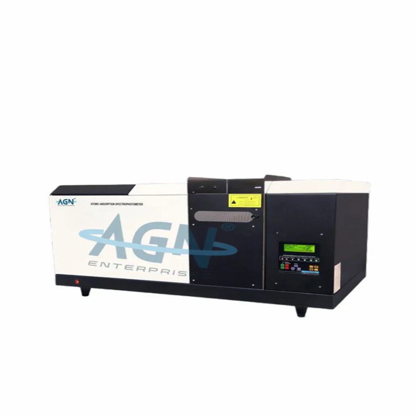Single beam AAS equipment with a 190-900 nm wavelength range. Features a deuterium lamp, 0.0-3.0 ABS absorbance range, and a corrosion-resistant nebulizer. Made in India.