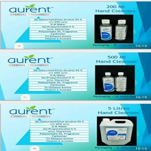 Aurent hand sanitizer with 71-80% ethanol and glycerol. Packaged in a 200 ML flip-top bottle. Minimum order quantity of 1000 units.