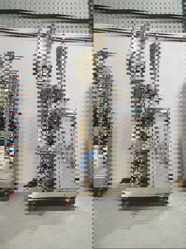 Electric driven, automatic bag packing machine. Features 100ml pouch capacity and 500 pouch/hour production. Made in India for efficient automated packaging.