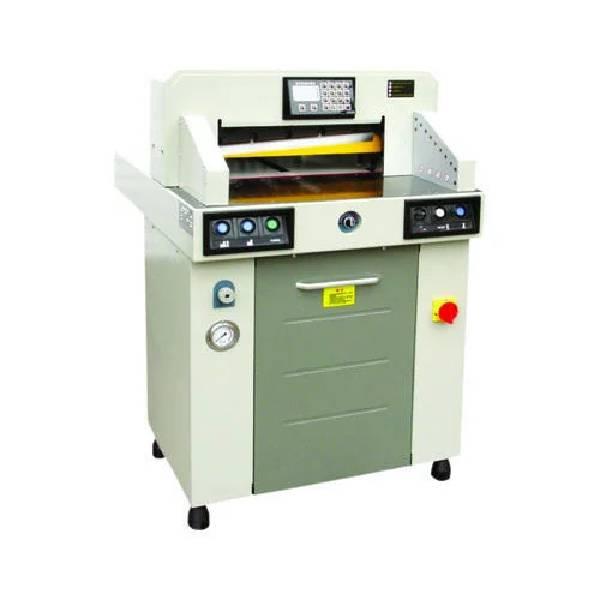 Automatic hydraulic paper cutter with iron base plate, powered by AC 220V/110V, 50Hz, 1.8KW. Features 6 months warranty.