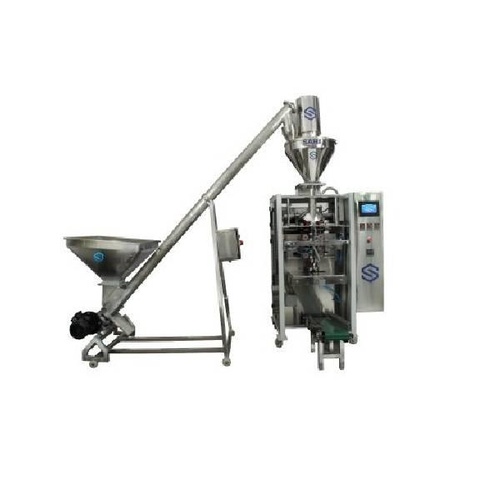 Automatic stainless steel auger filler machine, 5.5 kW, three phase, 440 V. Fills any powder up to 50 pouches/min. Dimensions: 1500 x 1200 x 3000 mm.