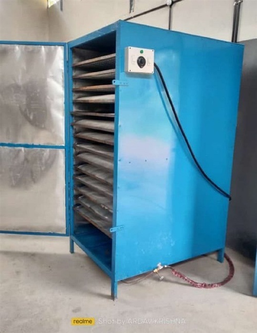 Automatic copra dryer with 200 kg/hour capacity. Operates at 240V, reaching 120°C. Constructed from MS with a painted finish. Regenerative desiccant dryer.