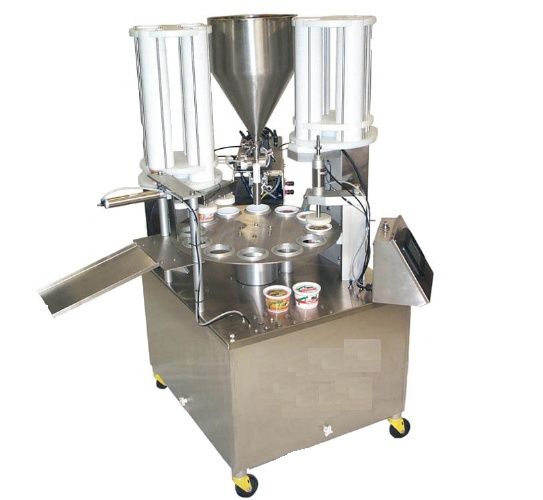 Automatic curd cup packaging machine with 2500 cups/hr capacity. Doses 500ml. Dimensions: 1295x1120x1950mm. Powered by 1.5 KW, weighs 350Kg.