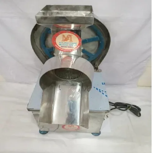 Stainless steel dry fruit slicing equipment with polished finish. Manual operation suitable for restaurant use, processing up to 150 kg per hour. Efficient and durable design.