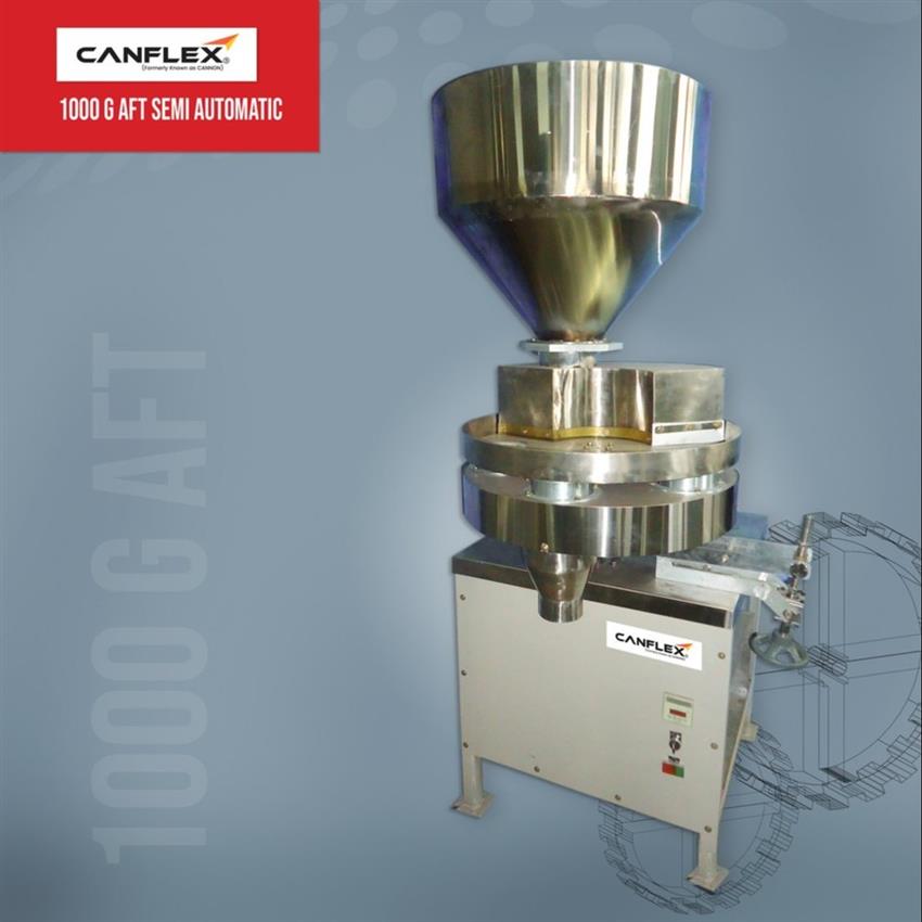 Volumetric cup filling machine with 4 cups, adjustable fill range up to 1000g. Features 100kg hopper, telescopic volume adjustment. Operates on 1.5 kW power, three-phase requirement.
