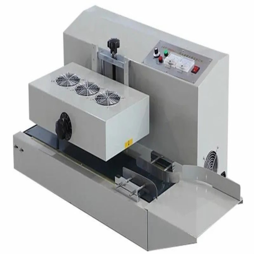 Stainless steel automatic induction sealing machine, portable design, vertical orientation. Ideal for new product applications. Made in India.