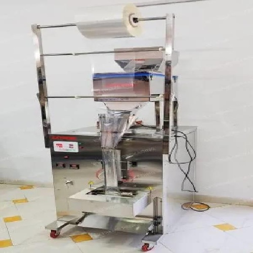 Electric semi-automatic kurkure packaging machine for grocery items. Features center seal, load sell system. Handles 500-1000 pouches/hour, 10-1000 Gm pouch capacity.