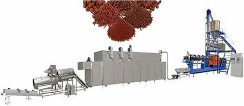 Made in India automatic stainless steel pet food production line. Features 5 hp motor, 50 Hz frequency, 415 V voltage, and a 1-year warranty.